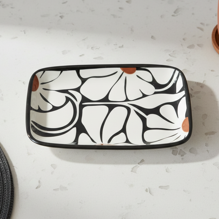 La Bandeja Pétalos de Tinta convierte un gesto de dibujo en una pieza funcional. Sobre blanco marfil, los trazos negros crean flores de líneas orgánicas que se abren paso entre acentos terracota, como tinta sobre papel. El acabado brillante aporta profundidad y luz al motivo, mientras el marco negro perfila su silueta. Úsala para servir (quesos, panes, frutas, sushi) o como pieza decorativa en aparador o pared: su presencia es gráfica, calmada y muy contemporánea.