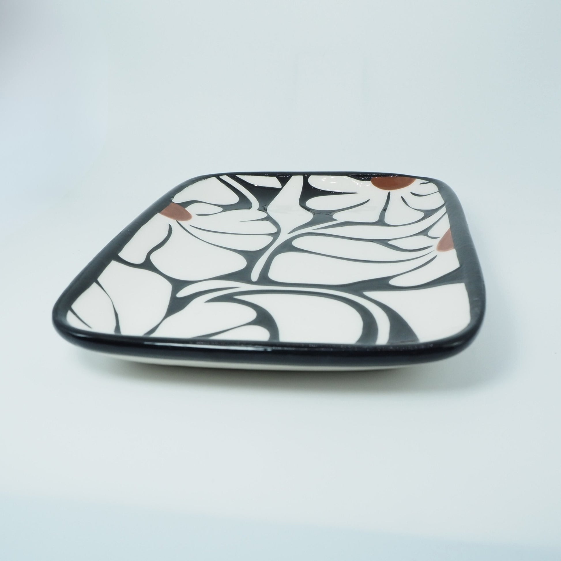 Cerámica esmaltada en blanco marfil con line art floral en negro y puntos terracota. Marco perimetral en negro. Acabado brillante.
