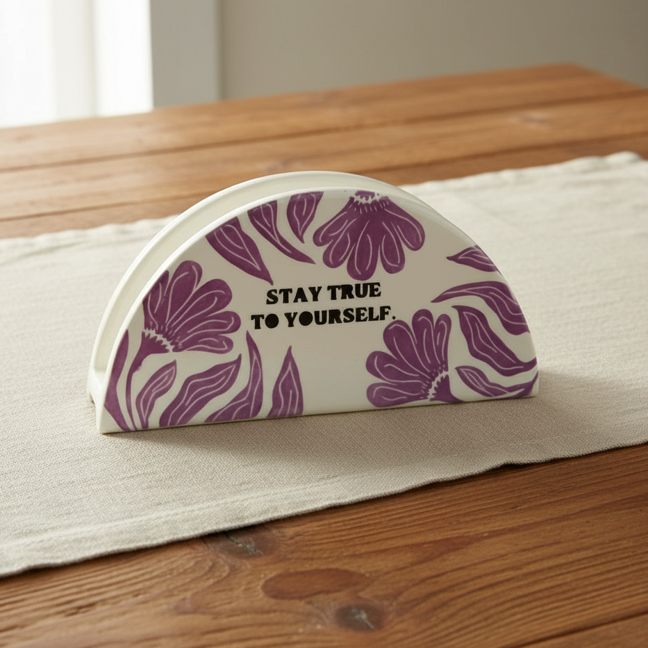 El servilletero “Stay True” pertenece a Piezas Únicas de Kinara: creaciones que nacen de la inspiración del momento y no se repiten. Realizado con esgrafiado artesanal, combina líneas florales grabadas a mano con el mensaje “Stay true to yourself” — sé fiel a ti mismo.