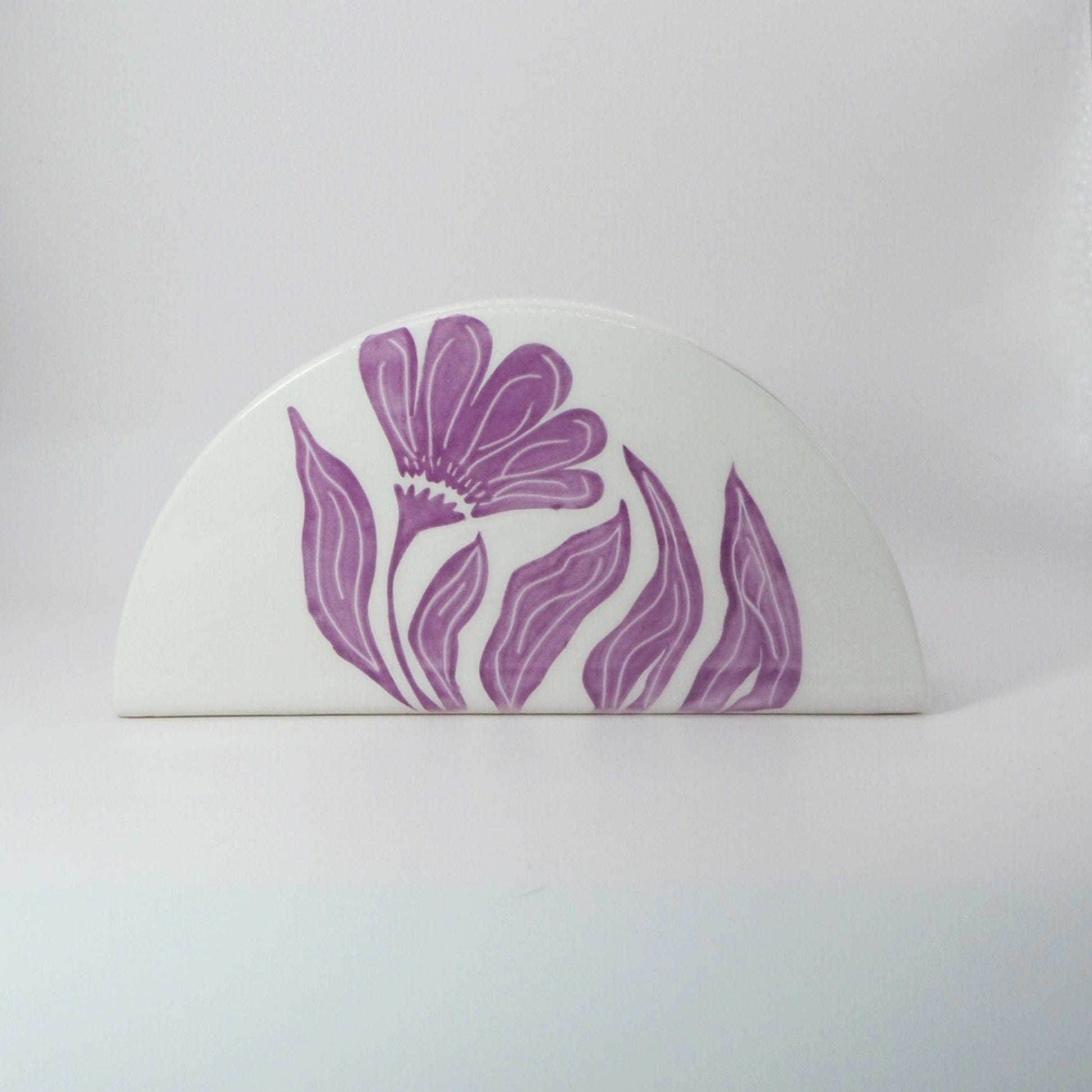 Cuerpo cerámico esmaltado en blanco marfil, motivos florales en morado uva y tipografía manual. Acabado brillante que realza el relieve del esgrafiado.